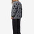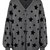 sehr groß geschnittener grauer Cardigan mit schwarzen Sternen, durchgehend geknöpft, V-Ausschnitt, 52% Viskose, 28% Polyester, 20% Nylon
