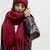 ganz weicher kürzer dafür breiter geschnittener Pulli in windsor wine mit roter Schrift, tief angesetzte Schultern, 52% Viskose, 28% Polyester, 20% Nylon